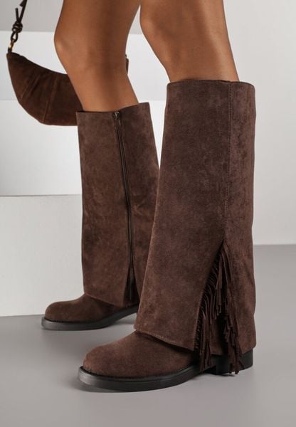 Brązowe Kozaki Ozdobione Frędzlami i Wywiniętą Cholewką Reilevia