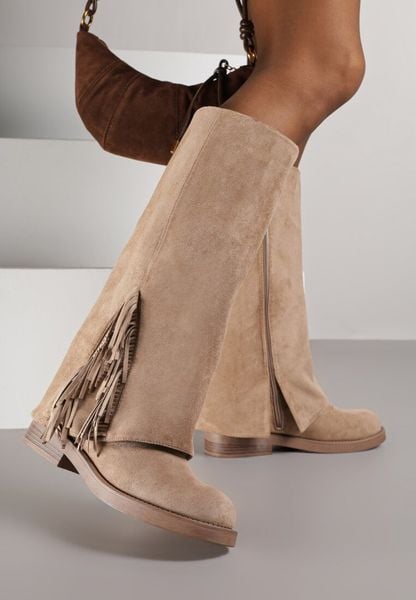 Ciemnobeżowe Kozaki z Wywiniętą Cholewką i Frędzlami Reisela
