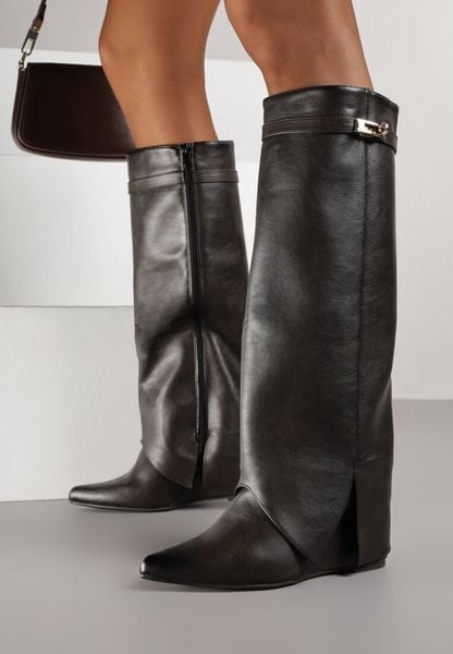Brązowe Kozaki na Koturnie z Wywiniętą Cholewką z Klamerką Arirass