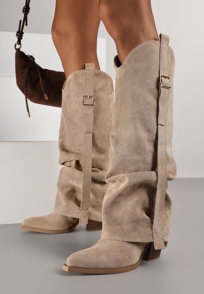 Ciemnobeżowe Kozaki na Stożku Typu Kowbojki Ozdobione Klamrą i Wywiniętą Cholewką Nalirella