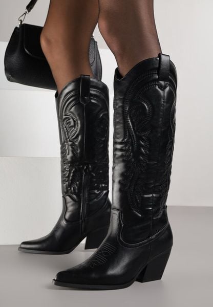 Czarne Kozaki Kowbojki na Stożku z Przeszywanym Wzorem na Cholewce Feressa