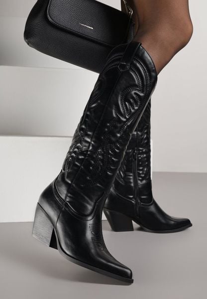 Czarne Kozaki Kowbojki na Stożkowym Obcasie Zdobione Przeszyciami Lumifera