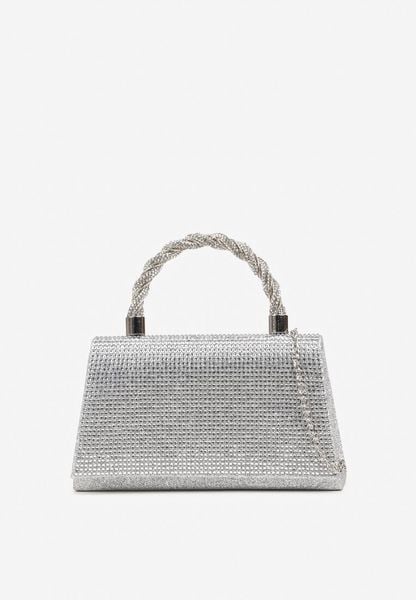 Srebrna Wieczorowa Torebka z Rączką Wykończona Cyrkoniami i Łańcuszkiem Fenagia