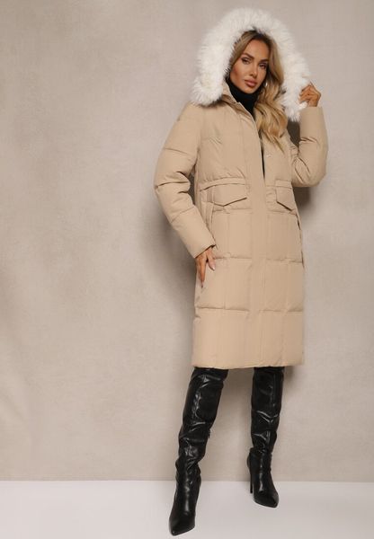 Beżowa Długa Kurtka z Pikowanymi Przeszyciami i Kapturem z Odpinanym Futrem Pretinae
