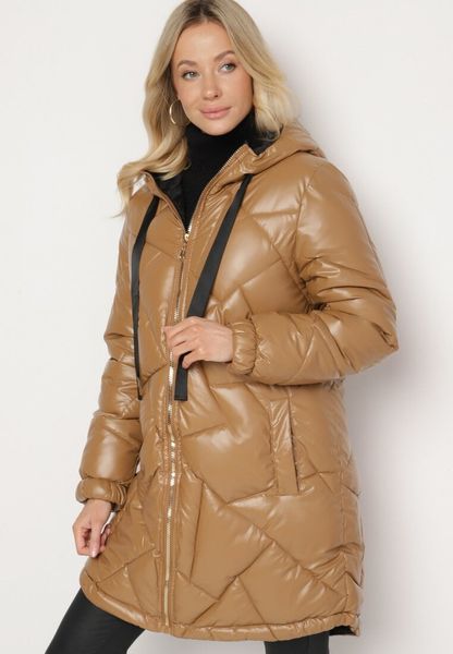 Jasnobrązowa Długa Pikowana Kurtka z Kapturem i Ściąganymi Sznurkami Norezi