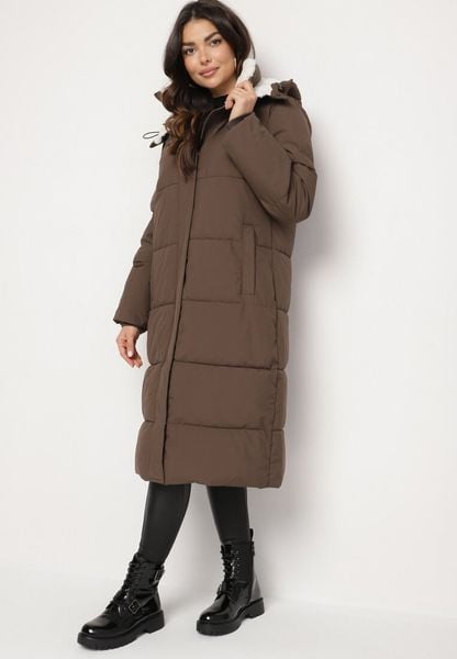 Brązowa Długa Kurtka Pikowana z Odpinanym Kapturem i Kieszeniami Etarose