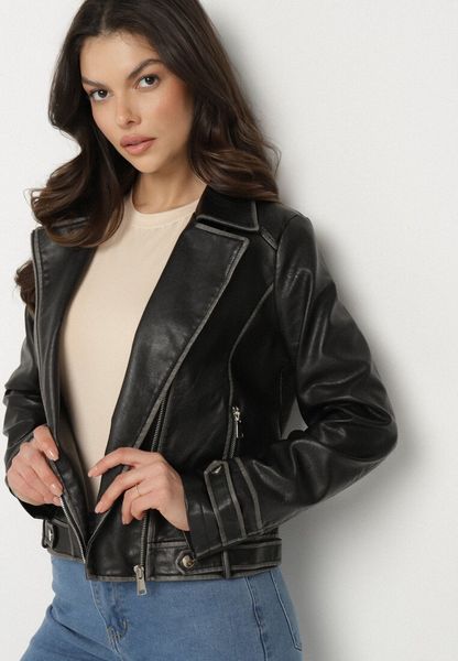 Czarna Kurtka Ramoneska z Nitami i Ozdobnymi Przeszyciami Adivila