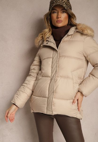 Jasnobeżowa Zimowa Kurtka z Pikowanymi Przeszyciami Kieszeniami i Kapturem z Odpinanym Futrem Ililda