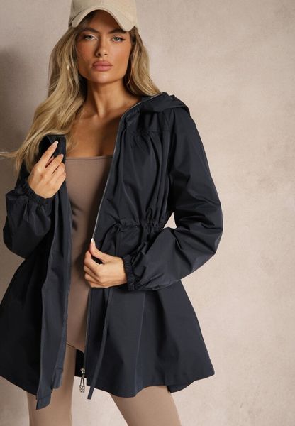 Granatowa Taliowana Kurtka w Stylu Parki z Kapturem Wykończona Ściągaczami Evieria
