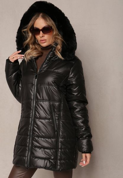 Czarna Pikowana Kurtka z Odpinanym Kapturem i Futerkiem Bellafi