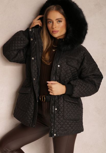 Czarna Pikowana Kurtka o Taliowanym Kroju z Kapturem i Futrzaną Podszewką Emithalla