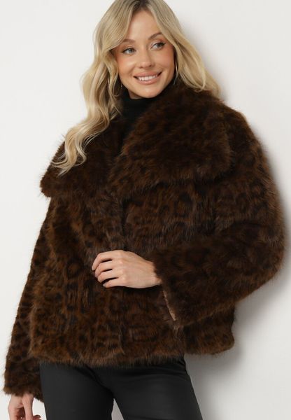 Brązowa Kurtka Futerko w Panterkę z Wsuwanymi Kieszeniami Nelaella