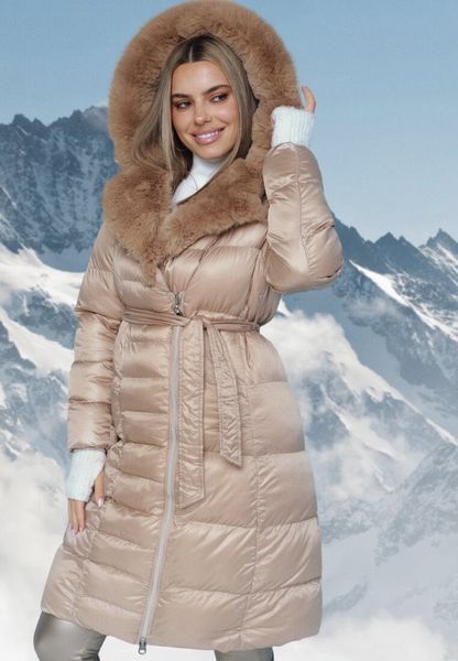 Beżowa Pikowana Kurtka za Kolano z Ozdobnym Futerkiem Velveti
