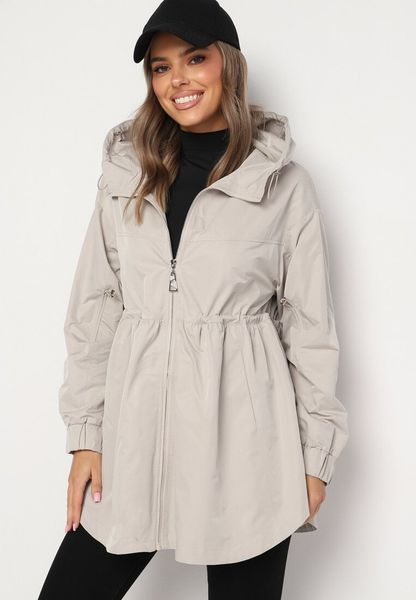 Beżowa Taliowana Kurtka w Stylu Parki z Kapturem Wykończona Ściągaczami Evieria