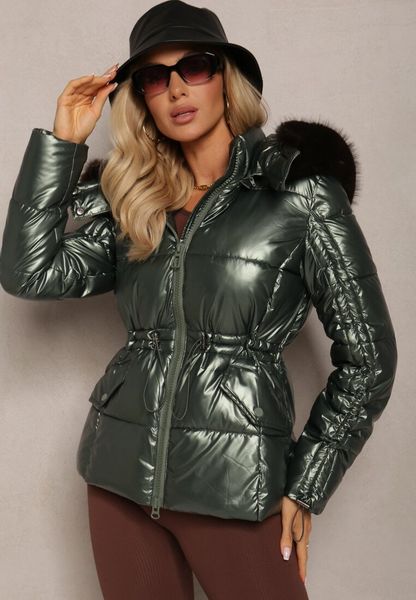 Zielona Pikowana Kurtka z Szerokim Kapturem z Futrzanym Kołnierzem Domenica