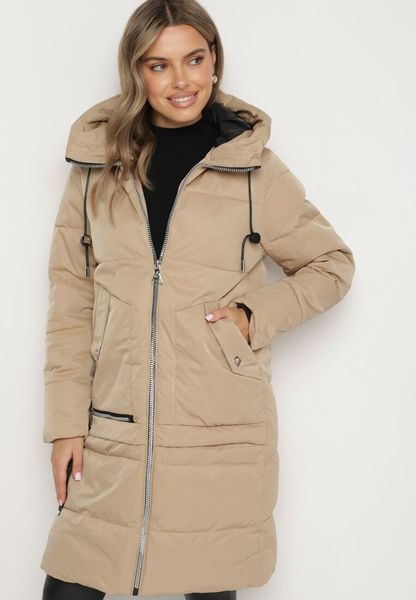 Ciemnobeżowa Klasyczna Kurtka z Pikowanymi Przeszyciami Kapturem i Kieszeniami Anrinna