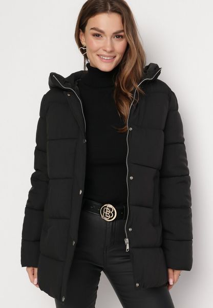 Czarna Kurtka Pikowana o Długim Fasonie z Nieodpinanym Kapturem i Kieszeniami Nerilani