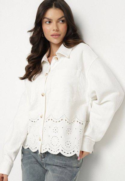 Biała Kurtka Koszulowa z Kieszeniami i Ażurowym Tłoczeniem Kaliven