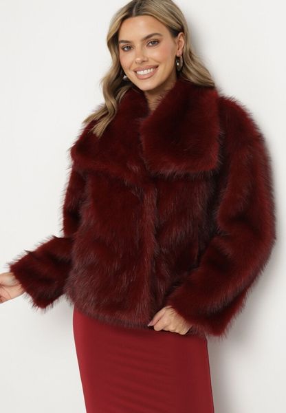 Bordowa Futrzana Kurtka z Szerokim Kołnierzem Merionnie