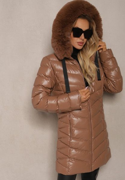 Brązowa Pikowana Kurtka o Prostym Kroju z Kapturem i Odpinanym Futerkiem Inavirae