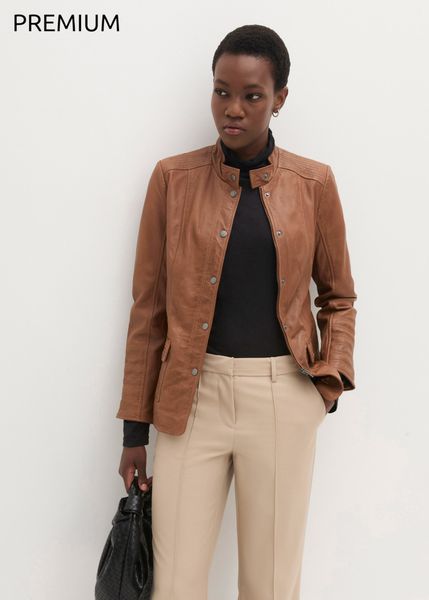 Klasyczna kurtka skórzana ze stójką i efektownymi detalami. Wysokiej jakości skóra jagnięca nappa to delikatna, wysokiej jakości skóra, która zachwyca swoją miękkością i trwałością. Naturalne nieregularności nadają tej wysokiej jakości skórze charakter i sprawiają, że każdy produkt jest wyjątkowy. Nasza delikatna skóra nappa jest garbowana roślinnie.