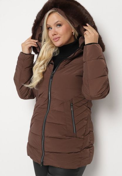 Brązowa Kurtka z Dwustronnym Suwakiem Odpinanym Kapturem i Futerkiem Itteira
