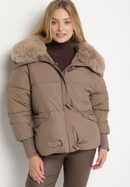 Brązowa Puchowa Kurtka Pikowana z Futrzanym Kołnierzem Lanivela