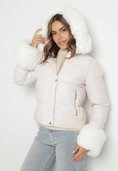 Biała Pikowana Kurtka z Kapturem Zdobiona Futerkiem Olenesa