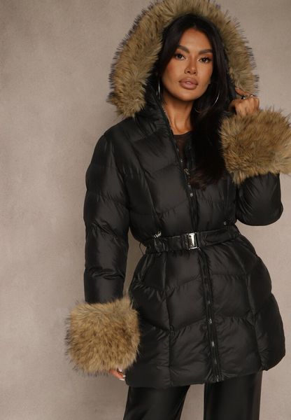 Czarna Kurtka z Pikowanymi Przeszyciami Kapturem i Futrzanymi Wstawkami Olerrea