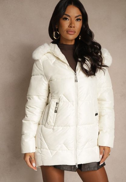 Biała Pudełkowa Kurtka z Pikowanymi Przeszyciami i Kapturem z Futerkiem Vebina