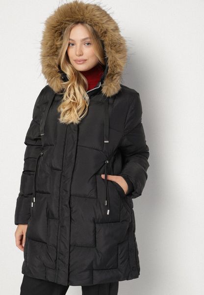 Czarna Pikowana Kurtka z Kapturem z Futerkiem Ruvite
