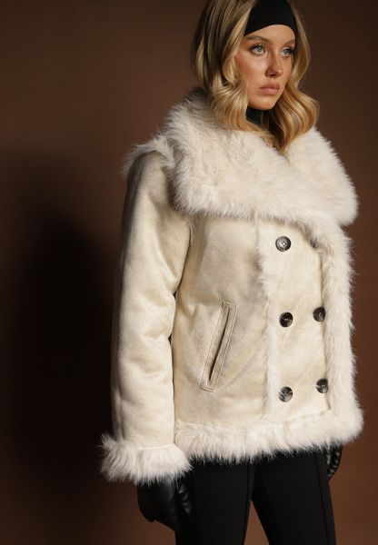 Beżowa Dwustronna Kurtka Biker Ozdobiona Futerkiem Flitta