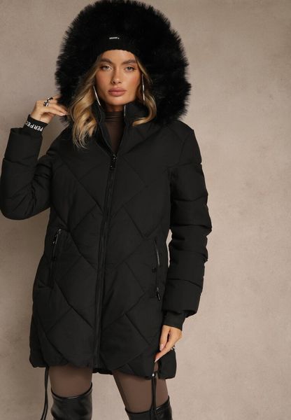 Czarna Trapezowa Kurtka z Pikowanymi Przeszyciami i Kapturem z Odpinanym Futrem Deoiala