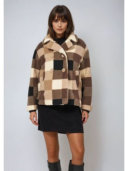 – kołnierzyk: z klapami- zapięcie: dwurzędowa listwa guzikowa- kieszenie: wpuszczane- krój: luźny- wzór: kratka- look: plusz