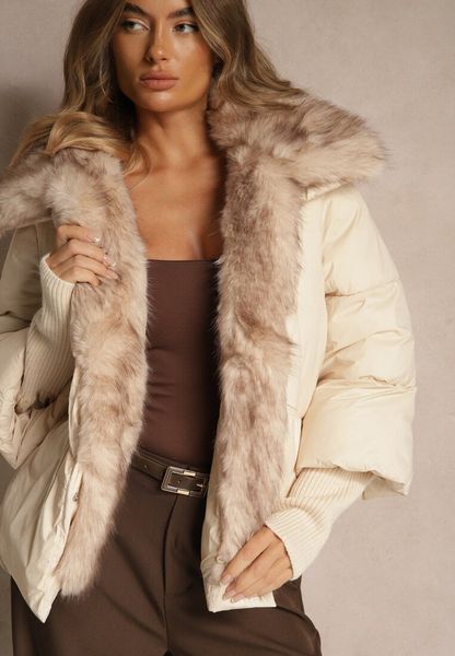 Jasnobeżowa Pikowana Kurtka z Szerokimi Ściągaczami i Ozdobnym Futrem przy Kapturze Inandria