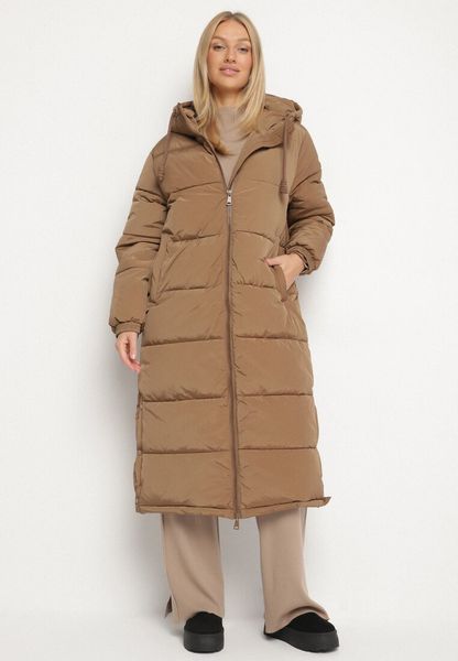 Brązowa Długa Kurtka z Pikowanymi Przeszyciami i Kapturem Unalleva