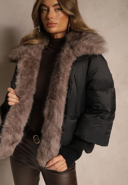 Czarna Kurtka z Pikowanymi Przeszyciami i Odpinanym Kapturem Ocieplana Futrem Reanara