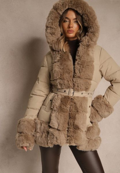 Beżowa Kurtka o Taliowanym Kroju z Paskiem Kapturem i Futerkiem Ranalia