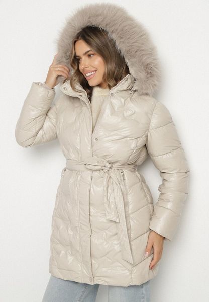 Beżowa Pikowana Kurtka z Odpinanym Kapturem i Futerkiem Wiązana Paskiem Olenessa