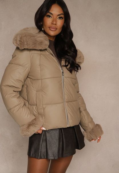 Brązowa Taliowana Kurtka z Pikowanymi Przeszyciami i Kapturem z Futrem Mundria