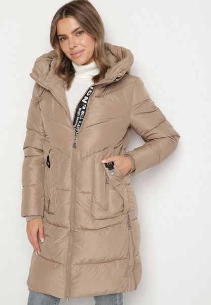 Beżowa Długa Kurtka Pikowana z Kapturem i Ozdobną Taśmą przy Suwaku Galorrea