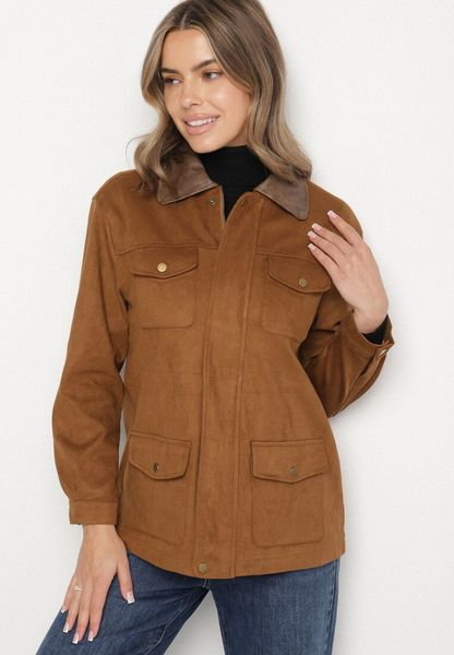 Brązowa Kurtka Koszulowa z Imitacji Zamszu z Kontrastującym Kołnierzem Raliandra
