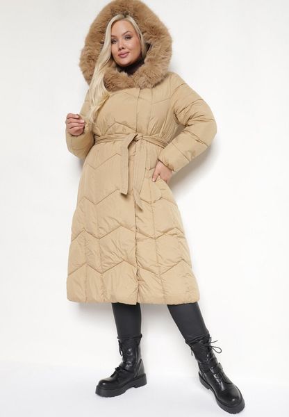 Ciemnobeżowa Pikowana Kurtka z Kapturem z Odpinanym Futrem i Wiązanym Paskiem Issaronia
