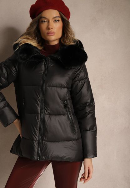 Czarna Kurtka Pikowana z Kapturem Ozdobiona Futerkiem i Dłuższym Tyłem Rinloris