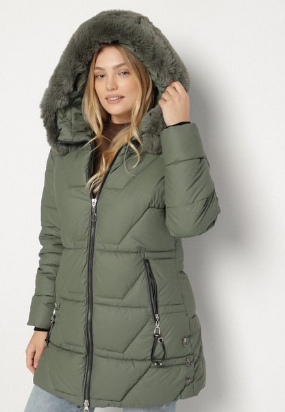 Zielona Taliowana Kurtka z Pikowanymi Przeszyciami i Kapturem z Futrem Avileria