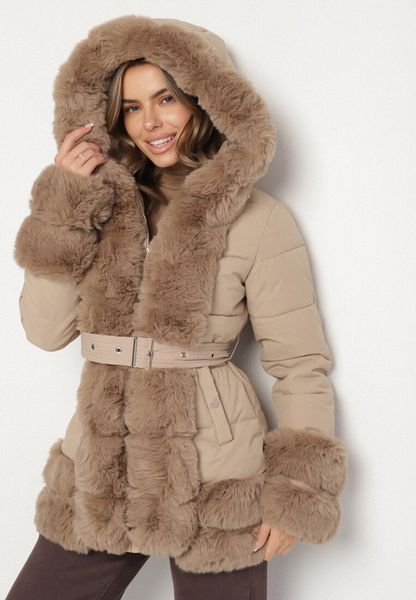 Beżowa Taliowana Kurtka z Paskiem Kapturem i Ozdobnym Futrem Rainaria