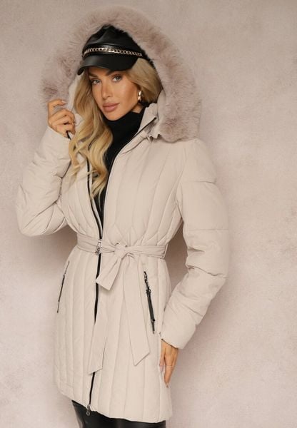 Beżowa Pionowo Pikowana Kurtka z Kapturem z Futrzanym Wykończeniem i Wiązanym Paskiem Leozelle