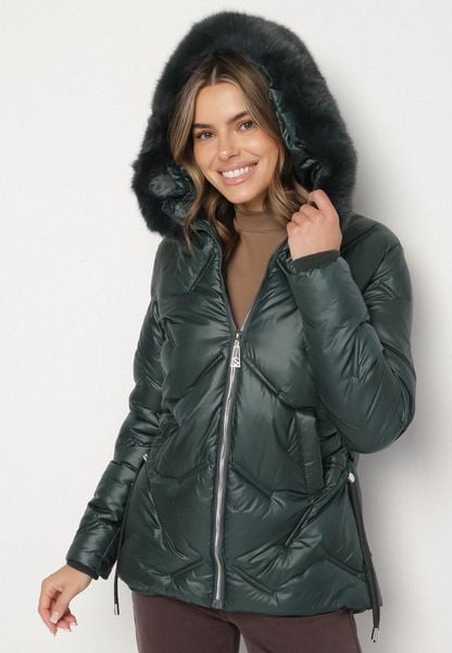 Ciemnozielona Kurtka z Oryginalnym Pikowaniem i Kapturem z Futerkiem Nallisa