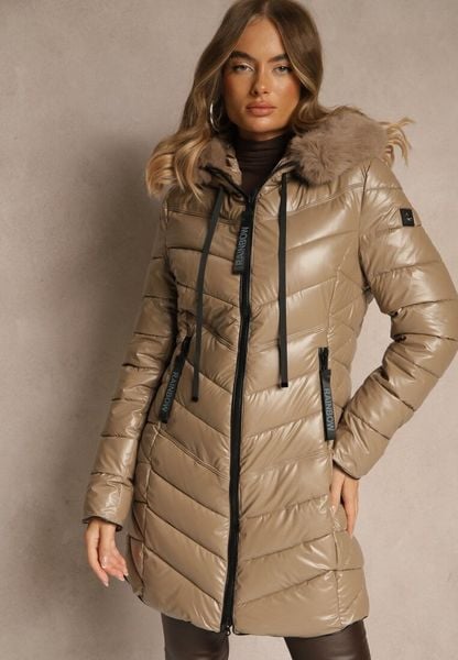 Brązowa Taliowana Kurtka z Pikowanymi Przeszyciami i Kapturem z Futrem Nalidea