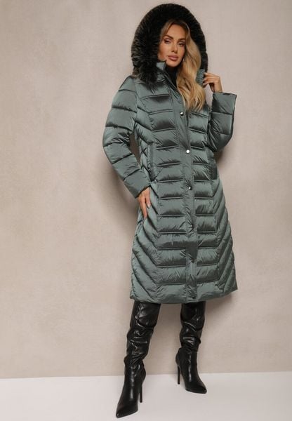 Zielona Długa Kurtka Zimowa z Pikowanymi Przeszyciami i Odpinanym Kapturem z Futerkiem Tinnelia